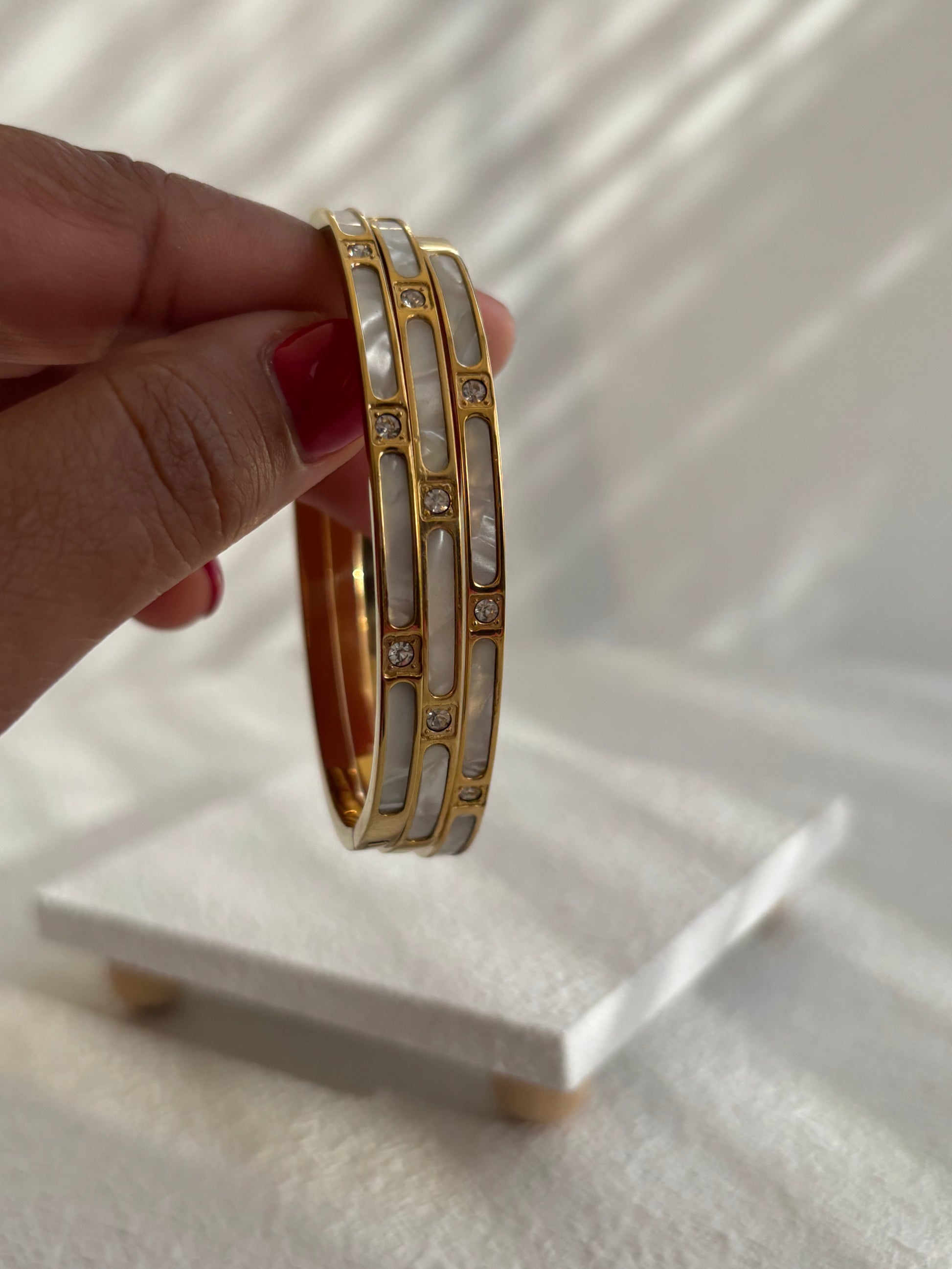 Brazalete rígido con detalles circulares en blanco y pequeños cristales que aportan un brillo delicado y elegante. Hecho en acero inoxidable 304 y bañado en oro 18K. Es hipoalergénico, resistente al agua y perfecto para lucir sola o en combinación con otras piezas. ✨