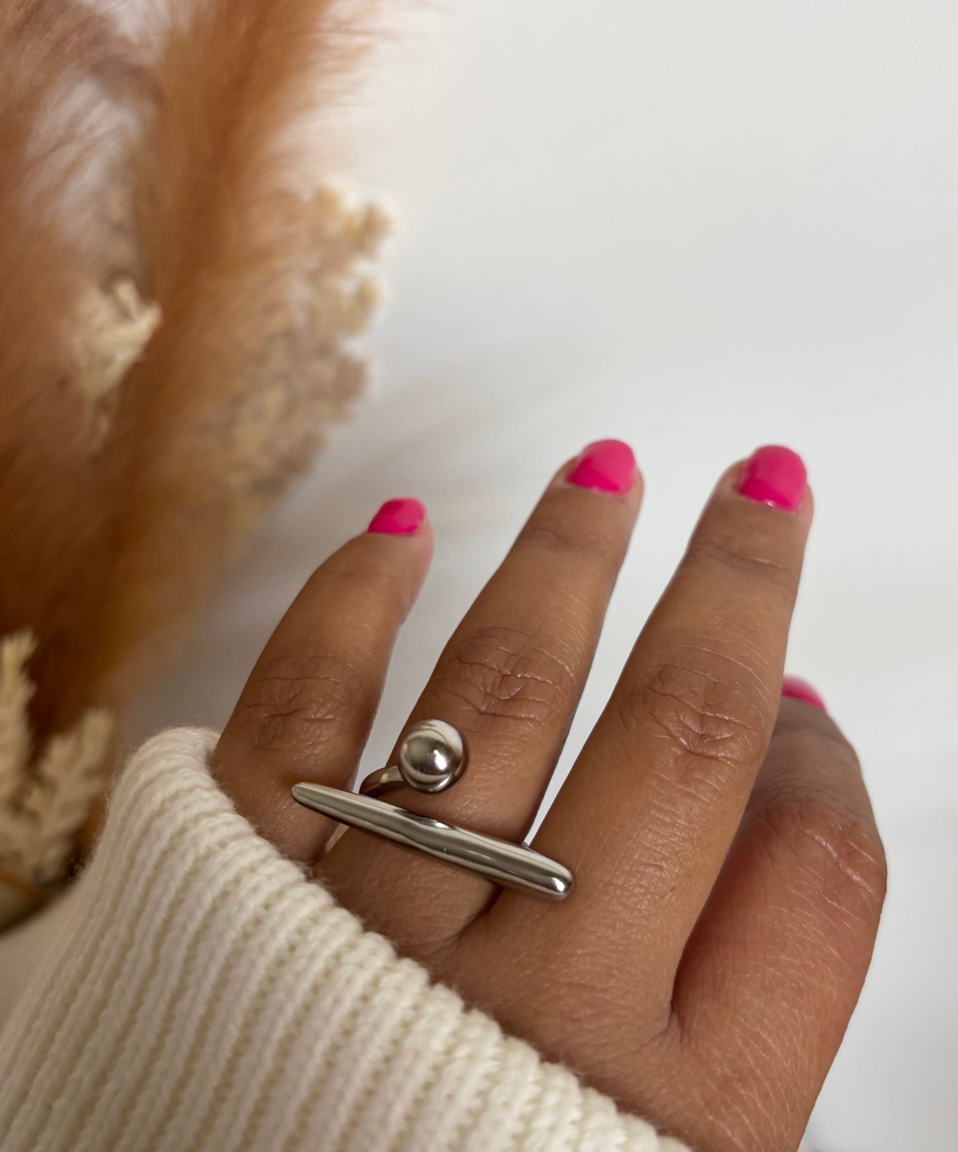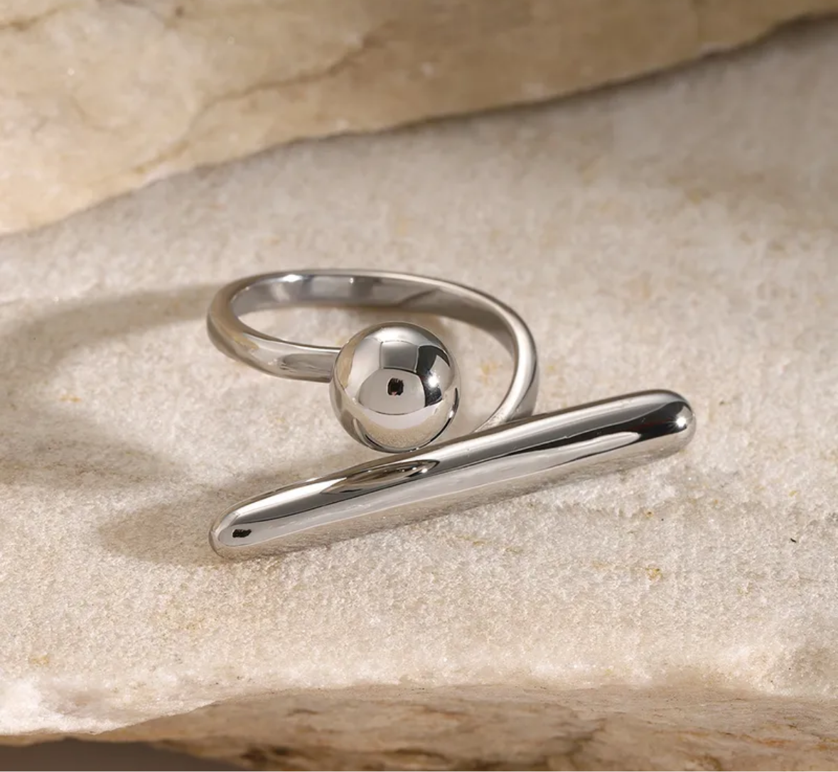 Diseño minimalista, impacto total. Esta sortija en acero inoxidable color plata combina una línea sutil con una esfera elevada, creando un look moderno y delicado. Ideal para llevar sola o en capas.