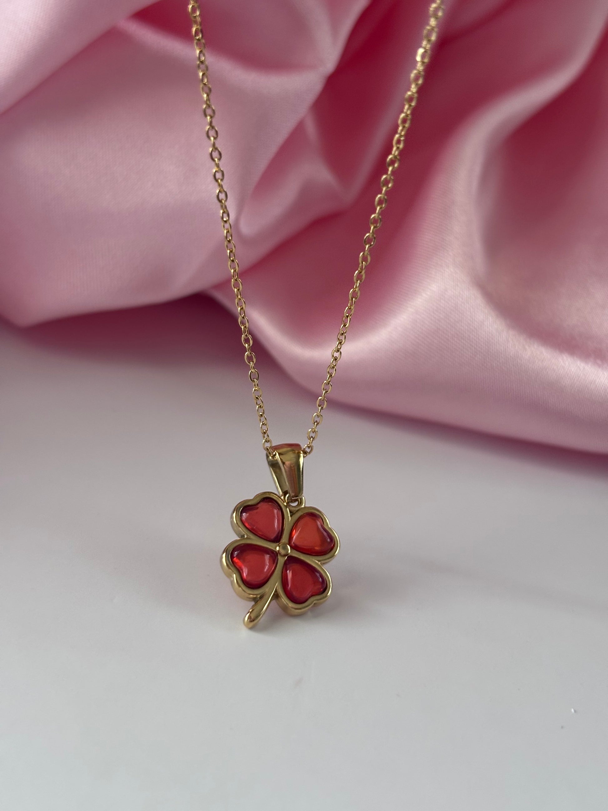 Collar dorado con dije de trébol de cuatro hojas en forma de corazones rojos. 💖