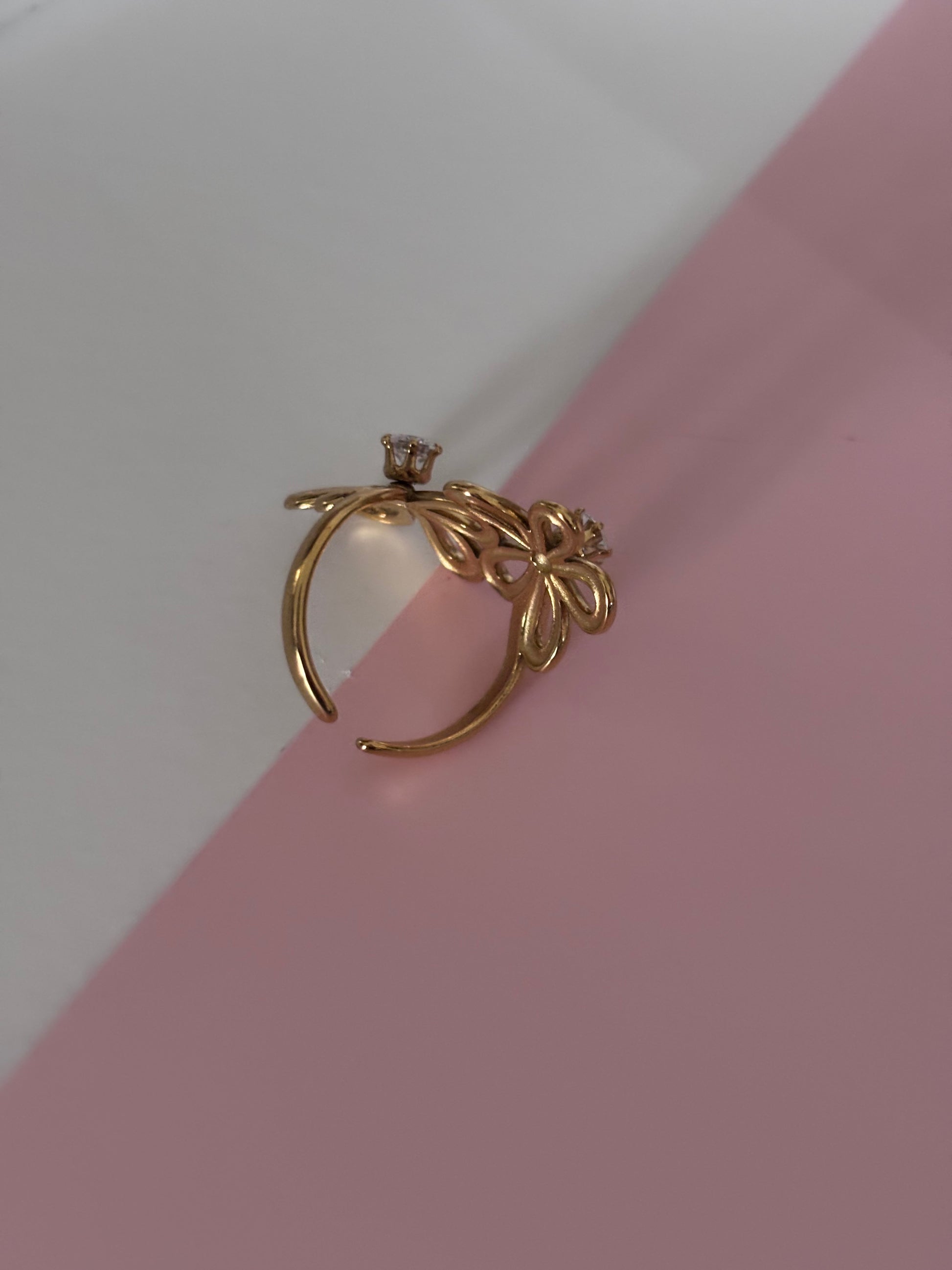 Anillo ajustable en acero inoxidable 316, con diseño doble de flores abiertas y cristales centrales que aportan brillo y delicadeza. Su acabado dorado lo convierte en la pieza perfecta para elevar cualquier look, desde lo casual hasta lo elegante. 🌸✨