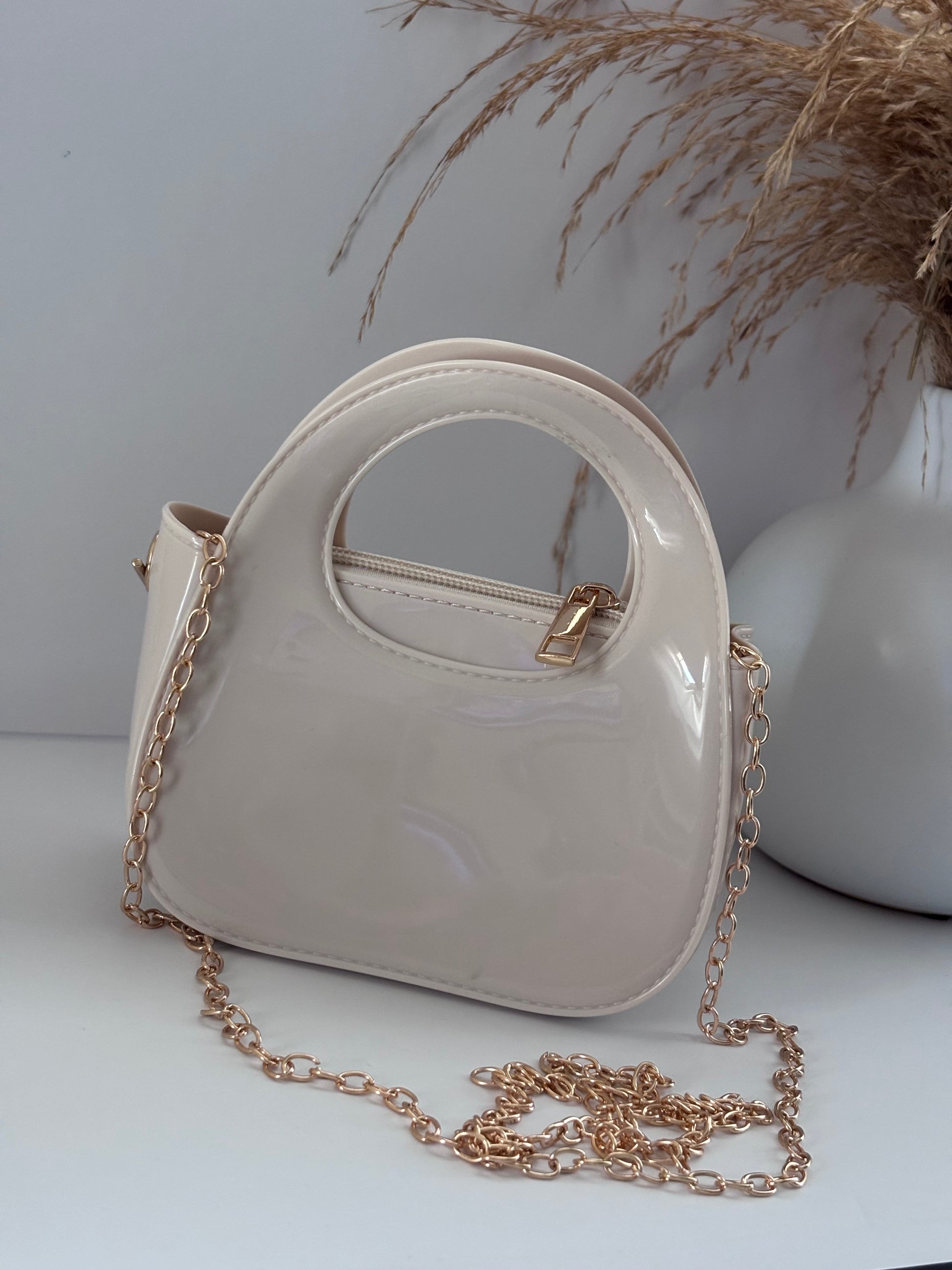 La Mini Glossy combina un acabado brillante tipo charol con cadena dorada para un look femenino, minimalista y súper trendy.