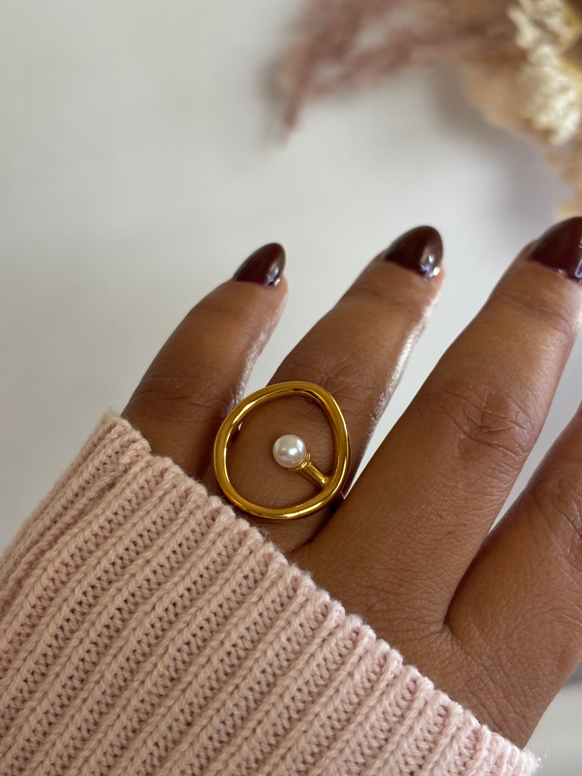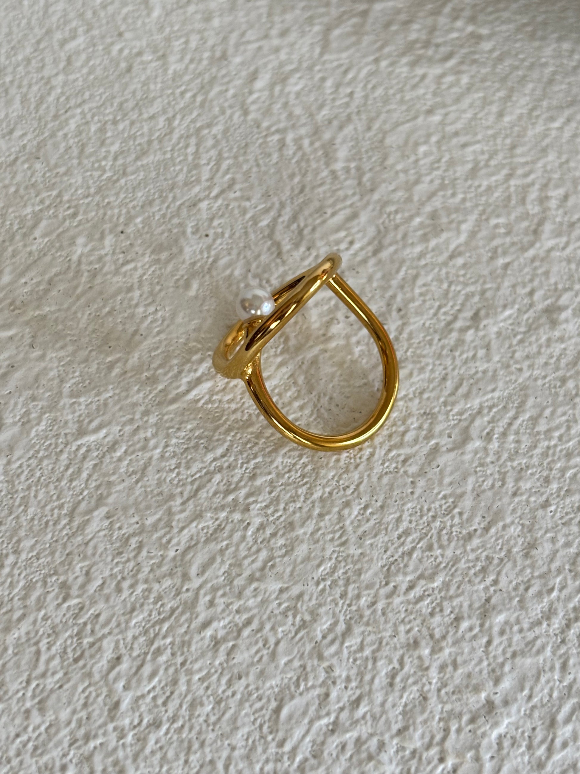 Sortija elaborada en acero inoxidable chapado en oro 18K, con un diseño circular irregular que realza la delicadeza de una perla blanca en el centro.