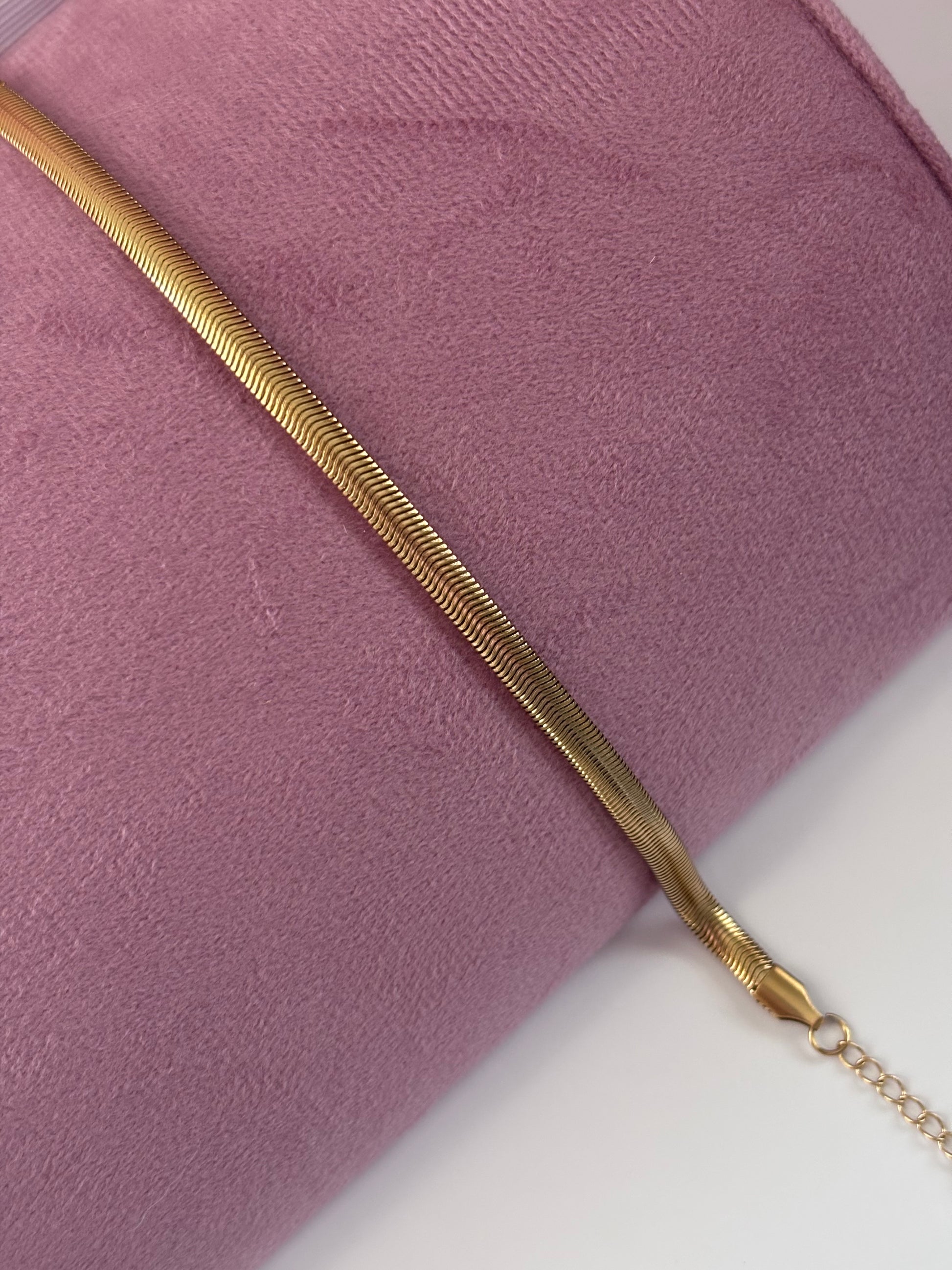 Pulsera tipo serpiente con acabado dorado brillante, elaborada en acero inoxidable 304. Su diseño liso y flexible aporta un toque moderno y sofisticado, ideal para usar sola o combinar con otras piezas.