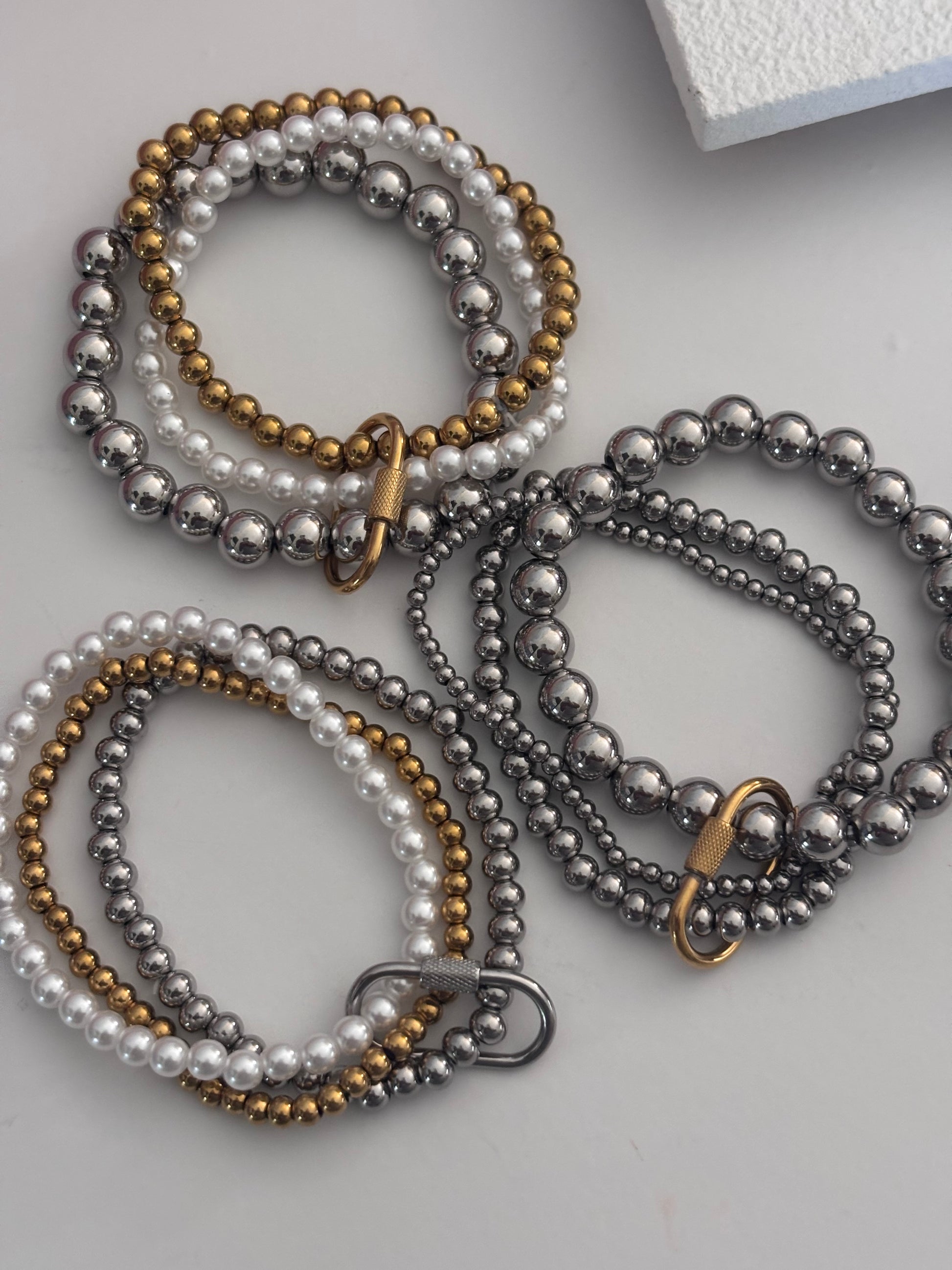 Set de brazaletes elásticos elaborados en acero inoxidable 304, con perlas sintéticas de brillo sutil.