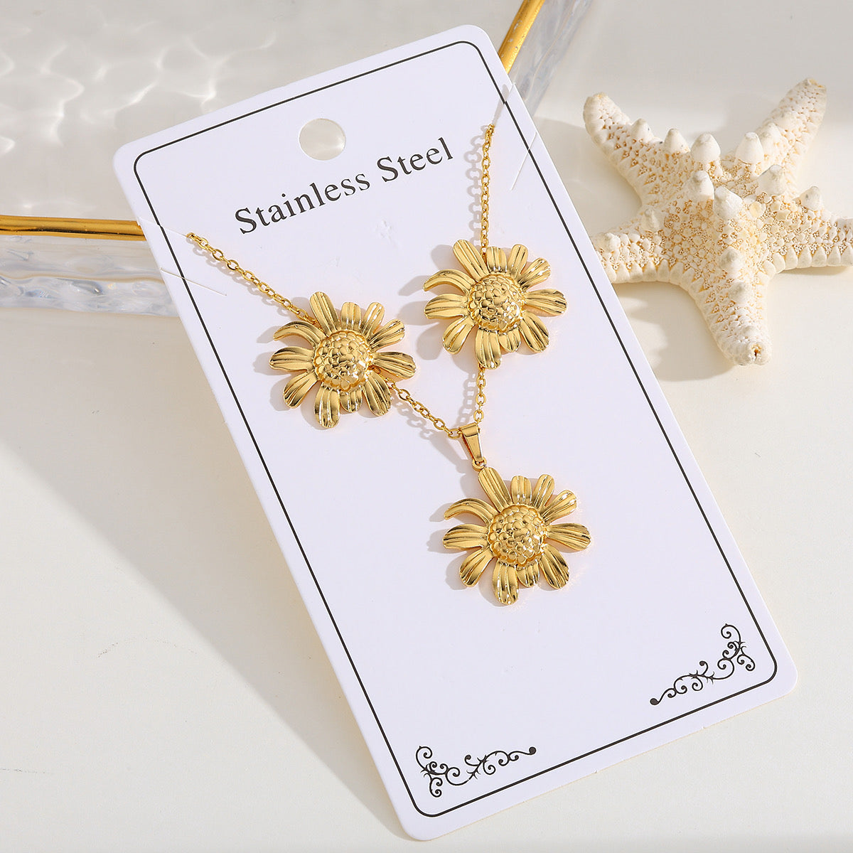 El Set Girasol Dorado está inspirado en la energía radiante del sol y la belleza natural de las flores. Incluye un collar con dije en forma de flor y unos aretes a juego, todo elaborado en acero inoxidable 18K, garantizando un brillo duradero y resistencia al agua. Perfecto para quienes aman destacar con un estilo fresco, chic y elegante.