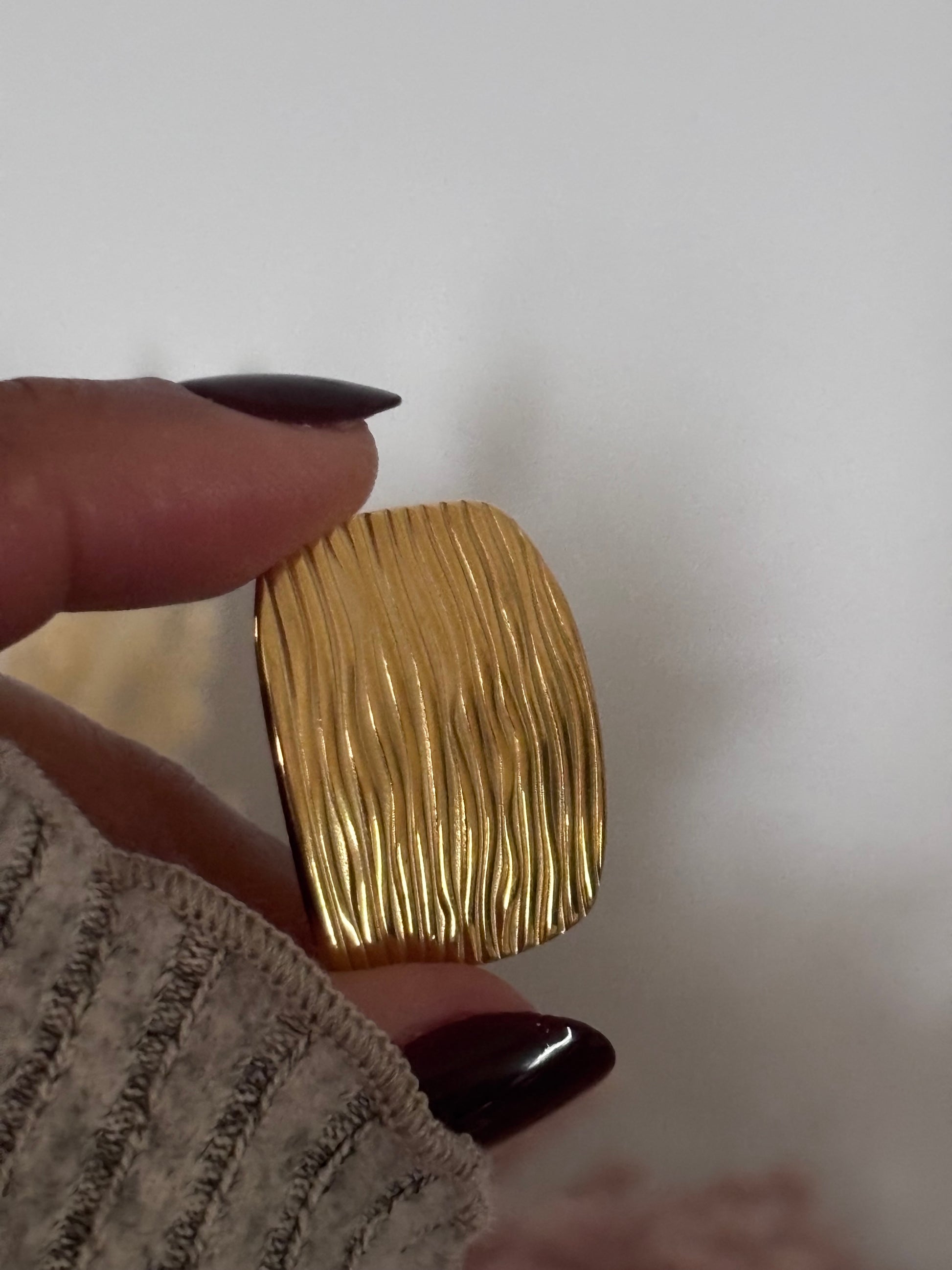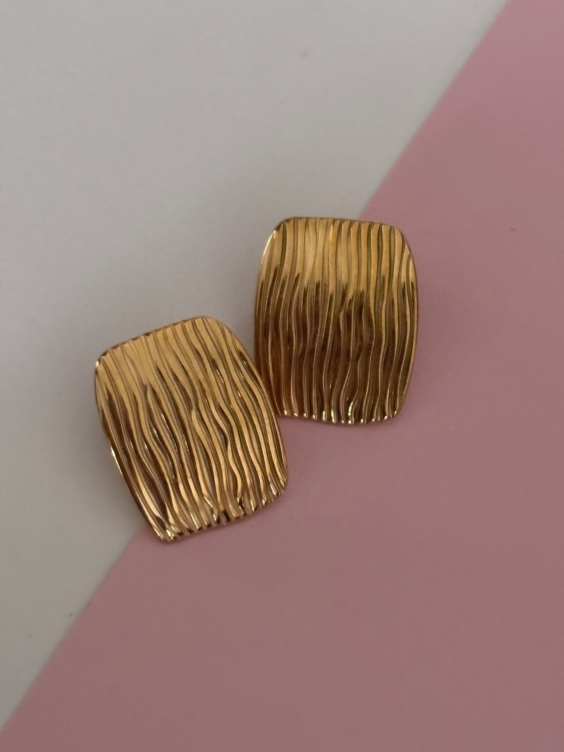 Aretes de diseño rectangular con textura ondulada en acero inoxidable 316 con baño de oro 18K. Una pieza versátil y sofisticada que aporta un toque moderno a cualquier outfit. Resistentes al agua e hipoalergénicos, ideales para usar todos los dÃas.